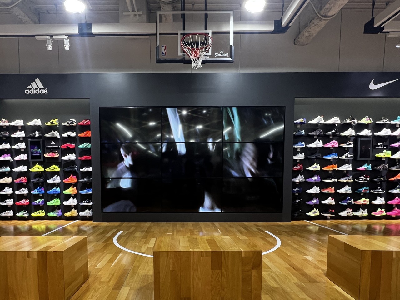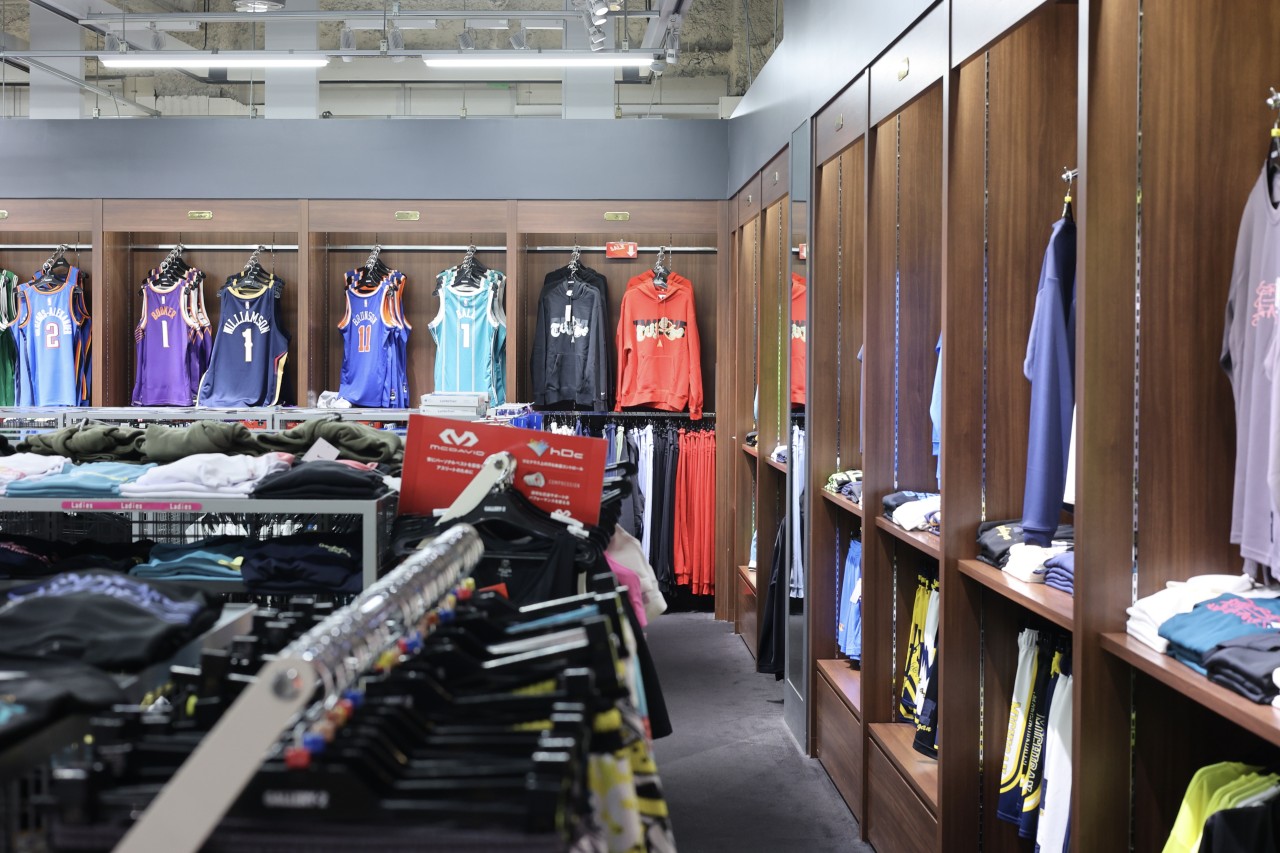 店舗には、NBA選手のユニフォームやチームグッズが美しく配置され、3歩進めば壁面にズラりと並べられたバッシュが映える。大型ビジョンに映し出されたスタイリッシュなバスケットボールの映像が流れ、お客さんはゆったりとした空間に込められたバスケカルチャーを感じながら買い物を楽しめる"聖地"だ。