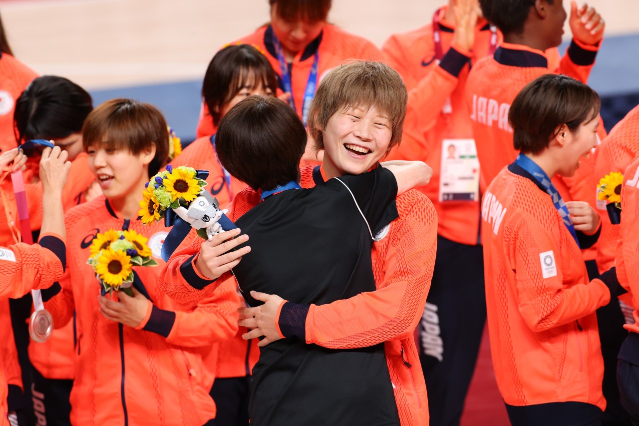 写真:東京五輪銀メダル獲得を喜び合う髙田真希(デンソーアイリス)/提供:長田洋平/アフロスポーツ