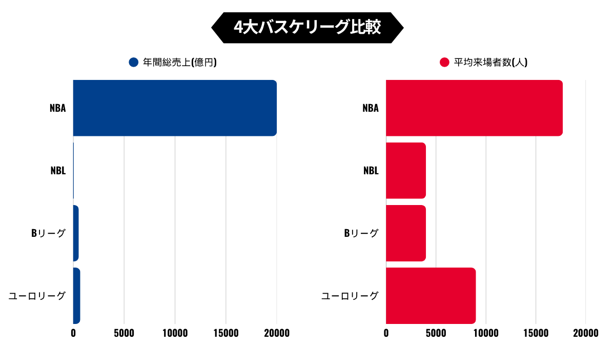 百聞は一見に如かず、圧倒的にNBAが独走状態であり、NBLやBリーグなどと比較しても圧倒的な存在感が数字上でも見て取れる。これはNBAが「世界最高のプロバスケットボールリーグ」であることの証であると同時に、NBLやBリーグとの差が大きいことも証明してしまっている。昨今話題になっているユーロリーグも同様だ。