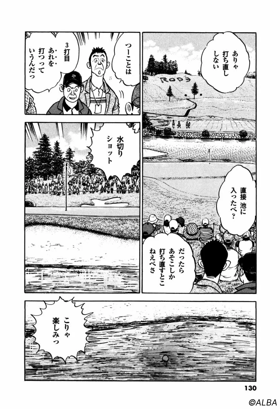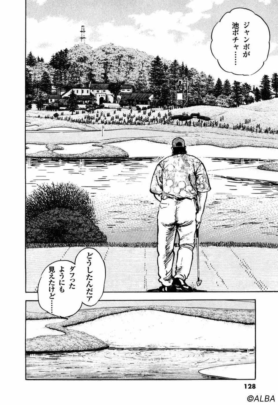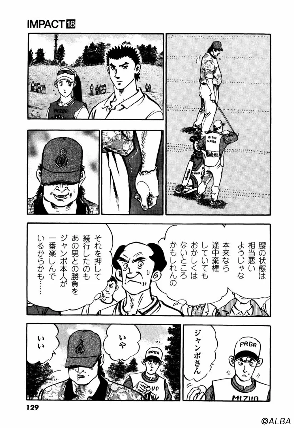 【前巻までのあらすじ】ミズオクラシック3日目、一丸はマッチプレーを仕掛けてきたジャンボ尾関から賭けを持ちかけされ、ジャンボが勝ったら一丸が刀鍛冶師時代に長年打ち込んで今なお作り上げることが出来ない古名刀の写しを作ること、一丸が勝ったらジャンボがプロゴルフ界を引退することを了承する。つまり、どちらかがゴルフをやめなくてはならないのだ。ジャンボの繰り出す「プロの技」に対し、向上心で追う一丸、互いに真剣勝負をおこなうなか、ジャンボを不審に思った桂はルール違反を犯し、試合中にご隠居に電話し、情報を求める。