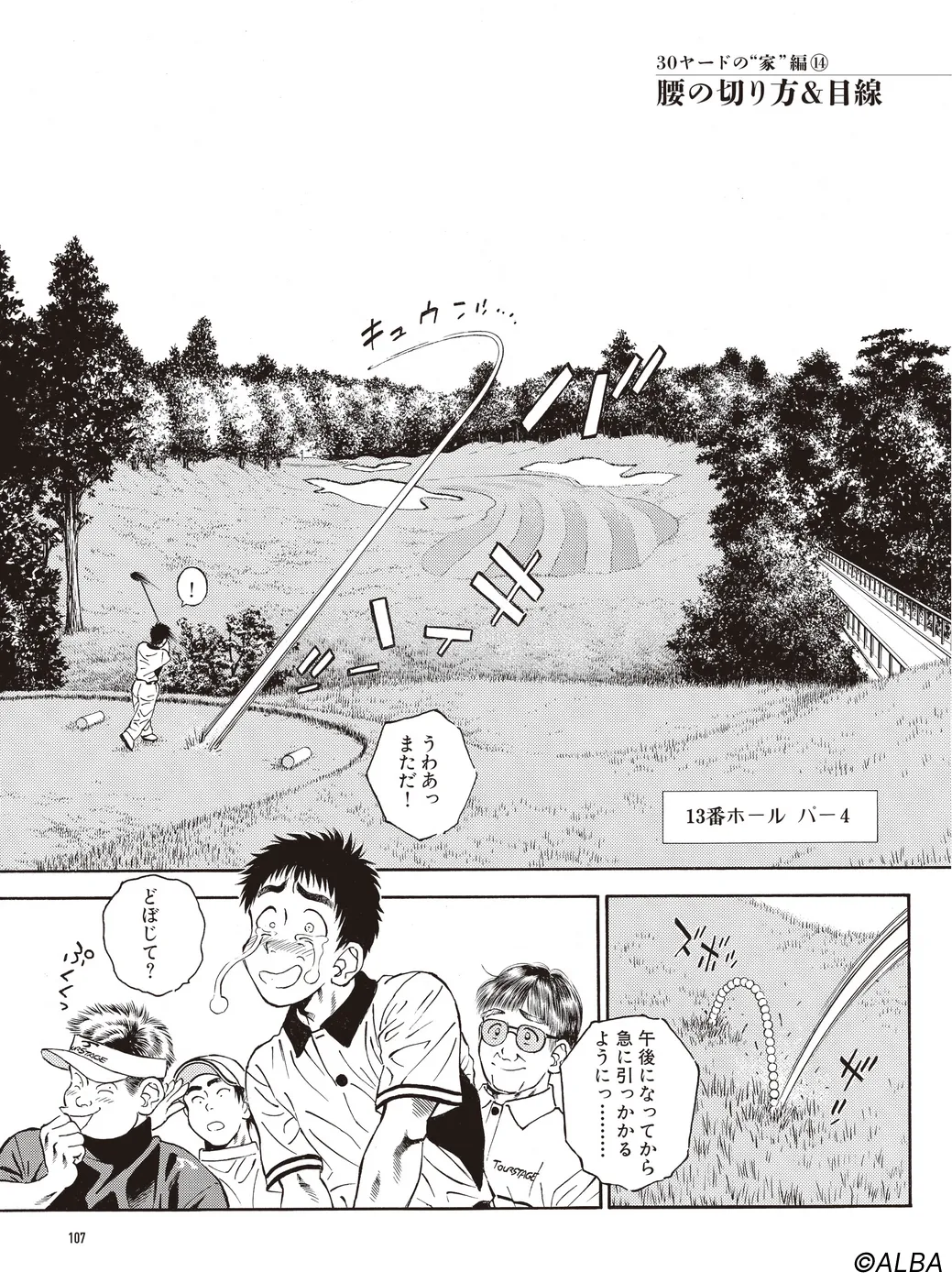 【30ヤードの“家”編 シリーズ概要】「どうしても上手くなりたい」と懇願してきたのは、会社の先輩から“万年100叩きのいつも百太郎”と揶揄される逸茂尺太郎(いつも しゃくたろう)。周りを見返したい思いをもって、宮里流の門戸をくぐった百太郎は、自分自身の“家”を完成させることができるのか…?(指導:宮里優/脚本:かわさき健/作画:本島幸久)