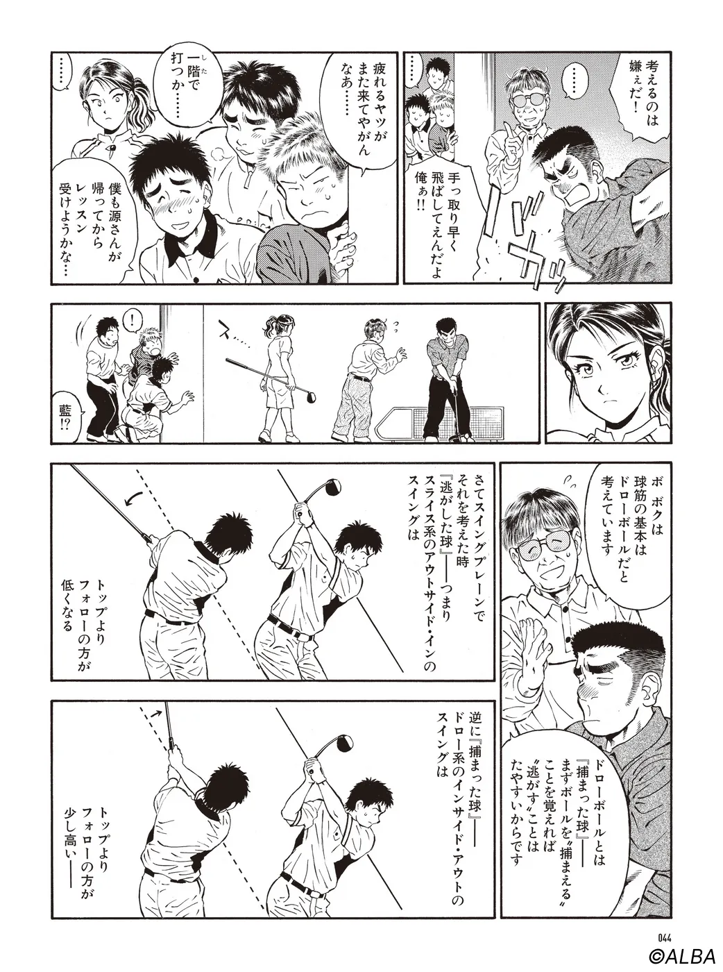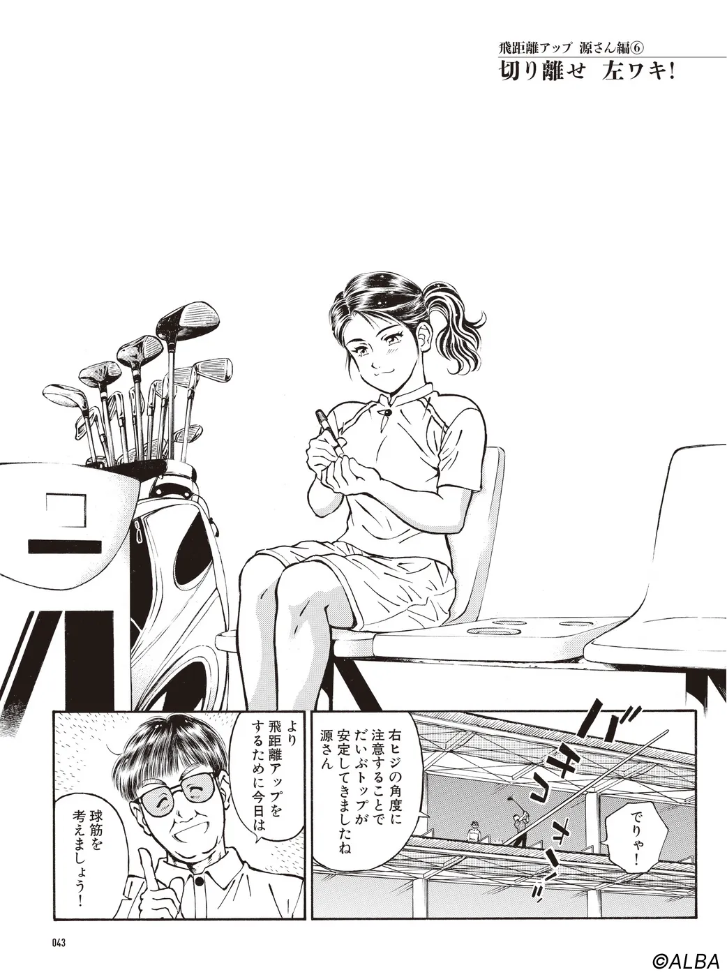 【飛距離アップ 源さん編|シリーズ概要】百太郎の上達を横目に、飛距離が落ちたことに悩むも「ゴルフは遊びだから」と強がる頑固者の源さん。素直にレッスンを受けない強情さに周りがあきれるなか、突如帰国した藍から指導を受けると、がぜんやる気モードに。不器用ながらも、宮里流を学び、念願の100切り達成を目指す。(指導:宮里優/脚本:かわさき健/作画:本島幸久)