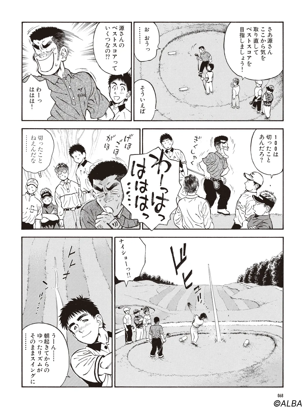 【飛距離アップ 源さん編|シリーズ概要】百太郎の上達を横目に、飛距離が落ちたことに悩むも「ゴルフは遊びだから」と強がる頑固者の源さん。素直にレッスンを受けない強情さに周りがあきれるなか、突如帰国した藍から指導を受けると、がぜんやる気モードに。不器用ながらも、宮里流を学び、念願の100切り達成を目指す。(指導:宮里優/脚本:かわさき健/作画:本島幸久)