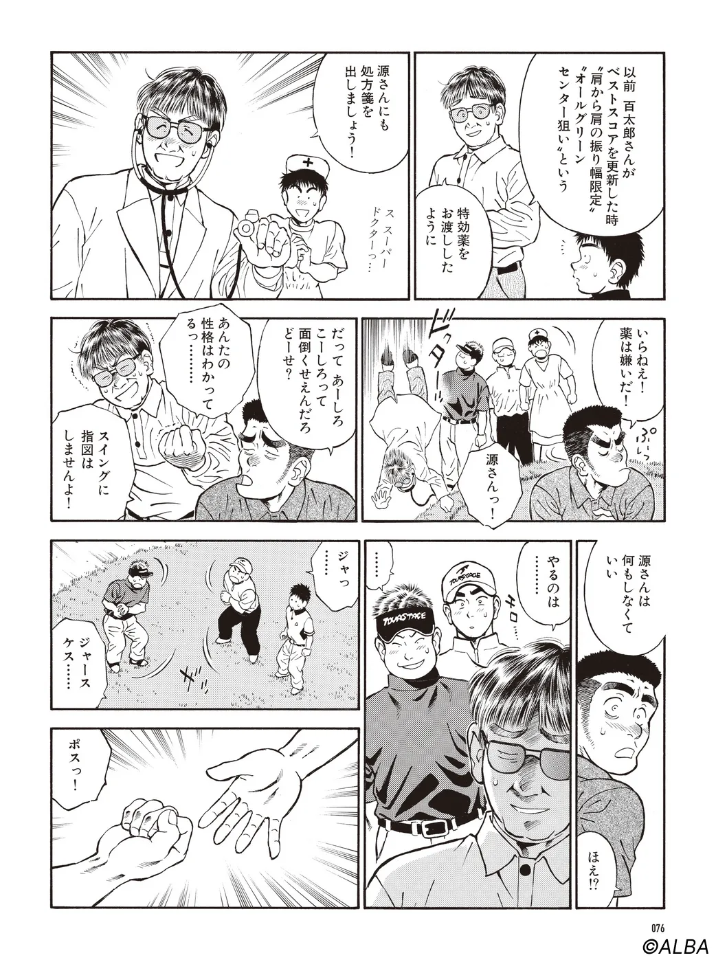 【飛距離アップ 源さん編|シリーズ概要】百太郎の上達を横目に、飛距離が落ちたことに悩むも「ゴルフは遊びだから」と強がる頑固者の源さん。素直にレッスンを受けない強情さに周りがあきれるなか、突如帰国した藍から指導を受けると、がぜんやる気モードに。不器用ながらも、宮里流を学び、念願の100切り達成を目指す。(指導:宮里優/脚本:かわさき健/作画:本島幸久)
