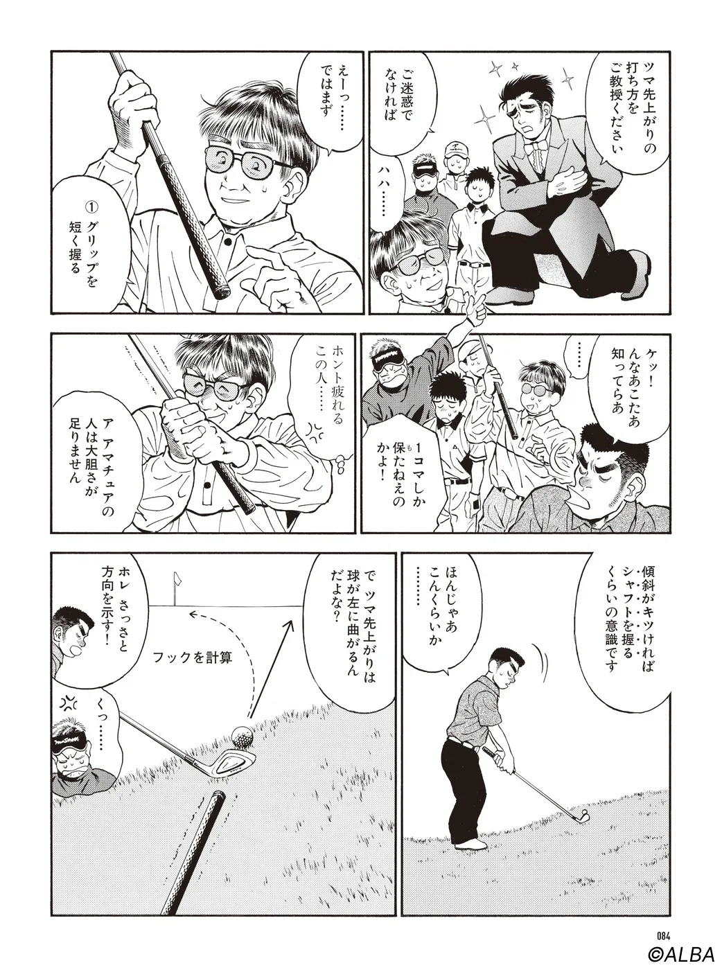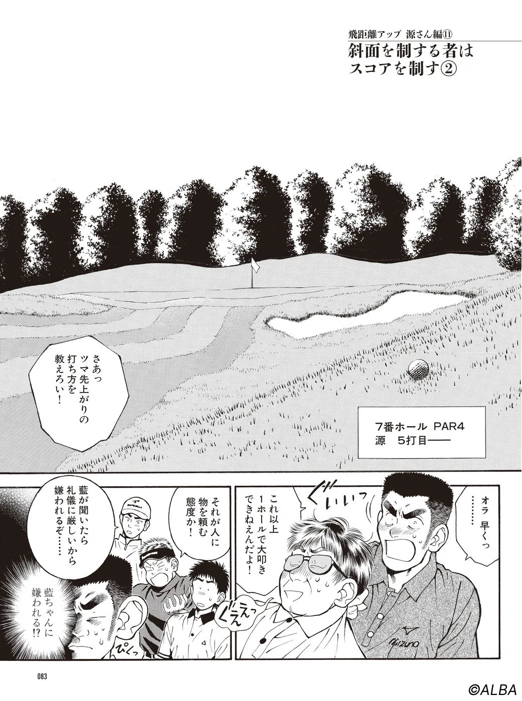 【飛距離アップ 源さん編|シリーズ概要】百太郎の上達を横目に、飛距離が落ちたことに悩むも「ゴルフは遊びだから」と強がる頑固者の源さん。素直にレッスンを受けない強情さに周りがあきれるなか、突如帰国した藍から指導を受けると、がぜんやる気モードに。不器用ながらも、宮里流を学び、念願の100切り達成を目指す。(指導:宮里優/脚本:かわさき健/作画:本島幸久)