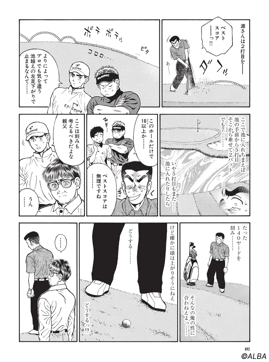 【飛距離アップ 源さん編|シリーズ概要】百太郎の上達を横目に、飛距離が落ちたことに悩むも「ゴルフは遊びだから」と強がる頑固者の源さん。素直にレッスンを受けない強情さに周りがあきれるなか、突如帰国した藍から指導を受けると、がぜんやる気モードに。不器用ながらも、宮里流を学び、念願の100切り達成を目指す。(指導:宮里優/脚本:かわさき健/作画:本島幸久)