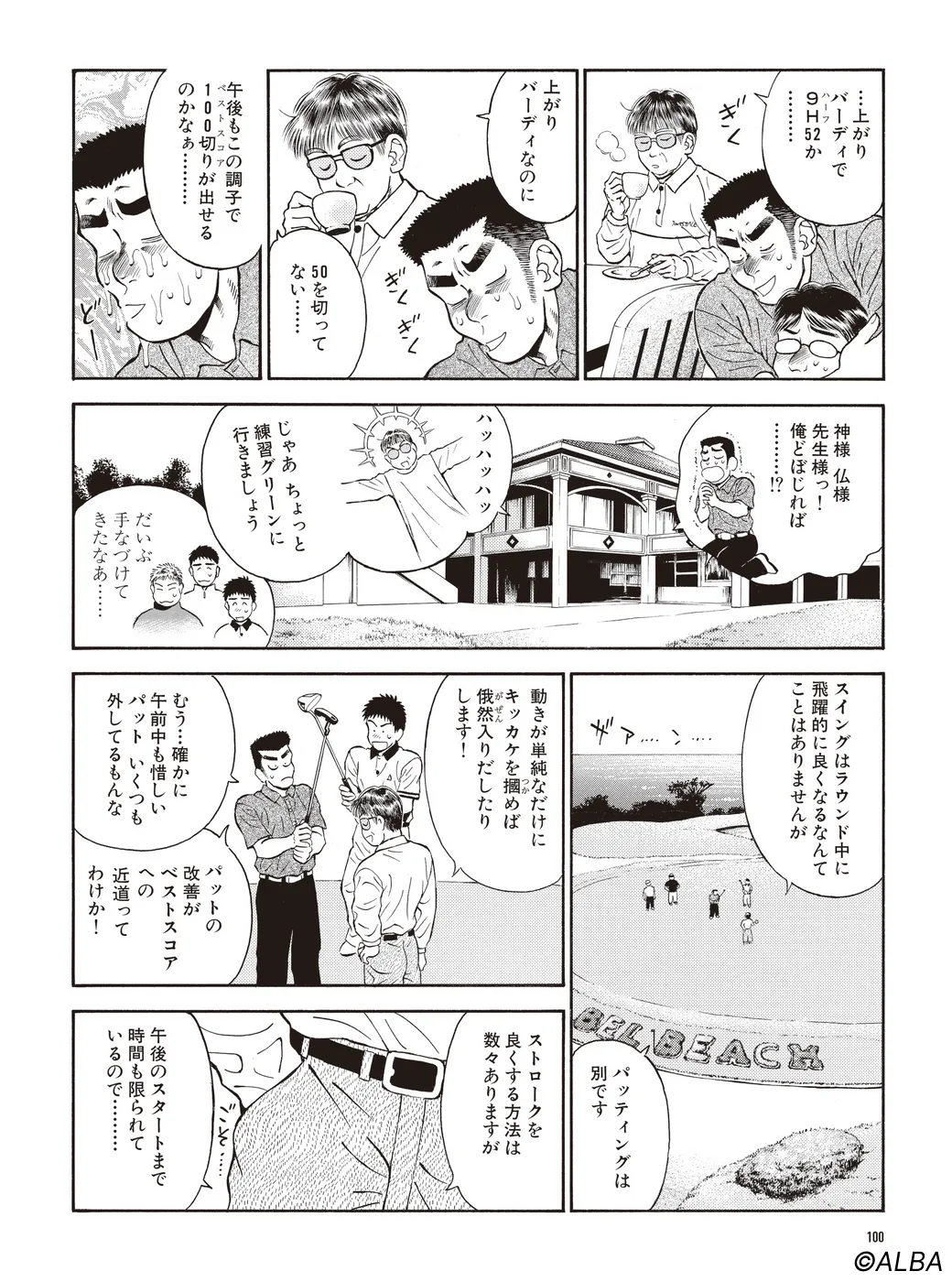 【飛距離アップ 源さん編|シリーズ概要】百太郎の上達を横目に、飛距離が落ちたことに悩むも「ゴルフは遊びだから」と強がる頑固者の源さん。素直にレッスンを受けない強情さに周りがあきれるなか、突如帰国した藍から指導を受けると、がぜんやる気モードに。不器用ながらも、宮里流を学び、念願の100切り達成を目指す。(指導:宮里優/脚本:かわさき健/作画:本島幸久)