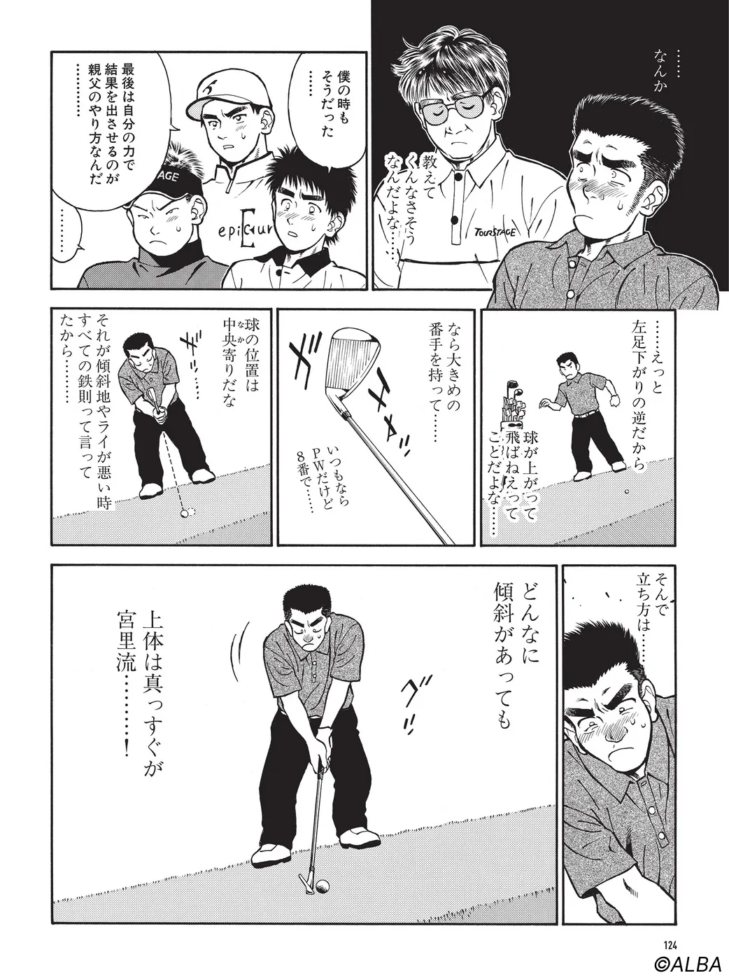 【飛距離アップ 源さん編|シリーズ概要】百太郎の上達を横目に、飛距離が落ちたことに悩むも「ゴルフは遊びだから」と強がる頑固者の源さん。素直にレッスンを受けない強情さに周りがあきれるなか、突如帰国した藍から指導を受けると、がぜんやる気モードに。不器用ながらも、宮里流を学び、念願の100切り達成を目指す。(指導:宮里優/脚本:かわさき健/作画:本島幸久)