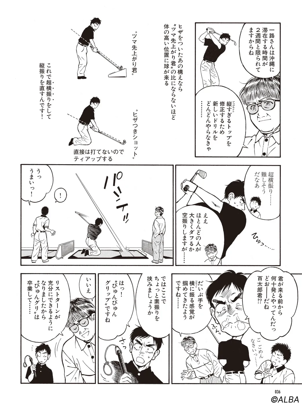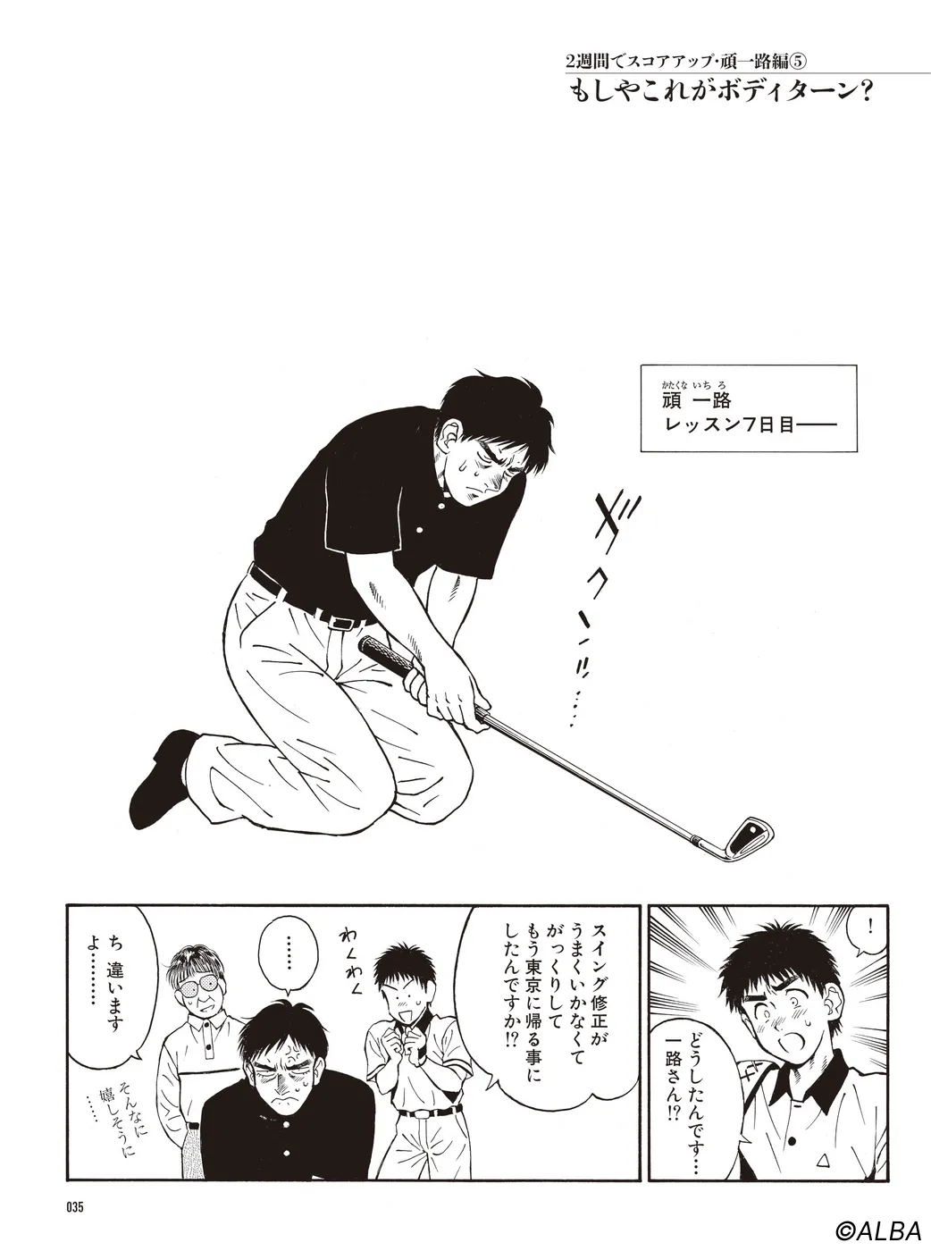【2週間でスコアアップ 頑一路編|シリーズ概要】目前に迫った社内コンペで結果を出すために、宮里流の指導を受けるべく、はるばる東京からやってきた頑一路(かたくな いちろ)。限られた2週間という期間のなかで、宮里流の真髄を体得することができるのか…。(指導:宮里優/脚本:かわさき健/作画:本島幸久)