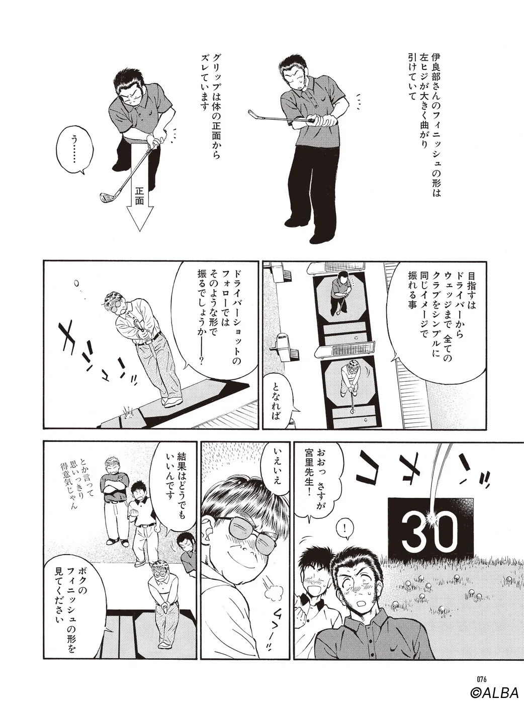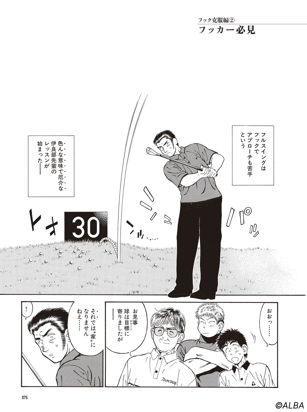 【フック克服編|シリーズ概要】格下扱いしてきた後輩・百太郎にスクラッチ勝負で敗れてしまったシングルゴルファーの伊良部(いらぶ)。百太郎の急成長の秘密を探るべく宮里道場へ偵察に赴くが、宮里優に自身のゴルフの課題を見透かされてしまう。積年の悩み・フックを克服するため、宮里流の指導を受けることに…。(指導:宮里優/脚本:かわさき健/作画:本島幸久)