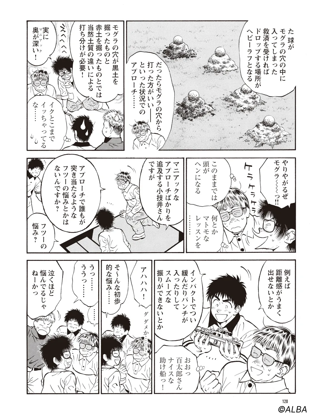 【マニアックショートゲーム編|シリーズ概要】今回の生徒は、ショートゲーム命のマニアック野郎・小技井 乃智(こわざい のち)。神出鬼没、頭でっかちで偏屈…厄介な門下生に振り回される宮里優、聖志、百太郎の面々だが、好奇心をもって指導を受け止める小技井に、宮里流のイマジネーションを伝授する。(指導:宮里優/脚本:かわさき健/作画:本島幸久)