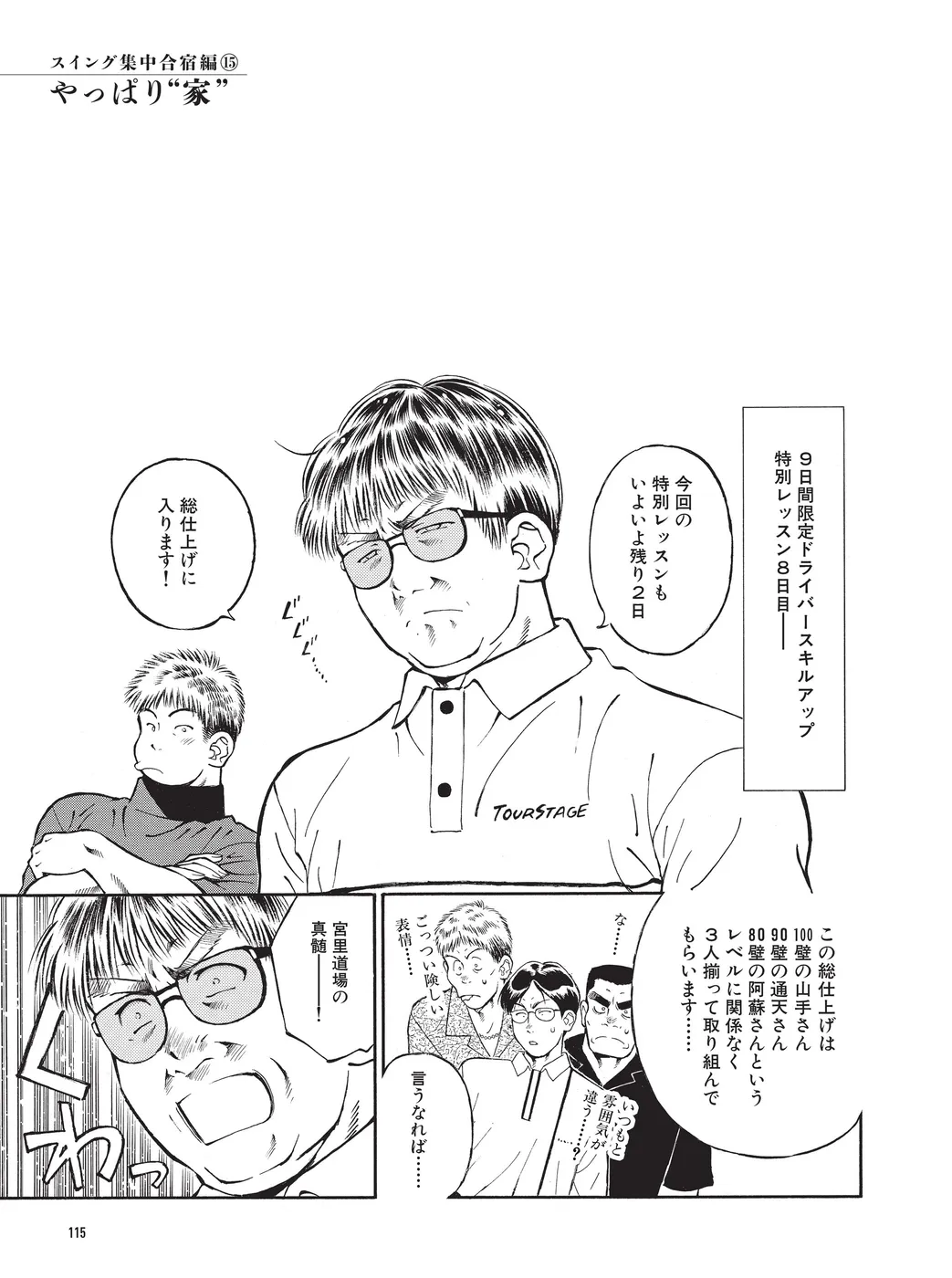 【スイング集中合宿編|シリーズ概要】宮里道場の生徒募集で集まってきた山手泉(いずみ)、通天覚(さとし)、阿蘇賛(さん)。100の壁、90の壁、80の壁…課題が異なる三人の悩めるゴルファーに対し、レベル別ドライバースキルアップレッスンが始まる…。(指導:宮里優/脚本:かわさき健/作画:本島幸久)