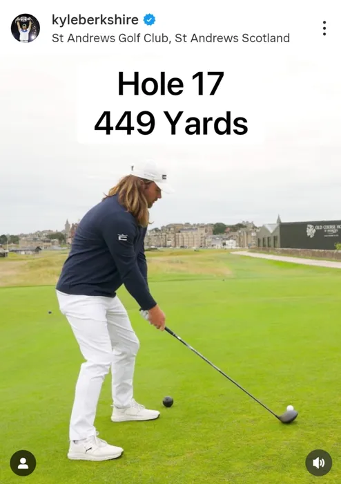 世界ドラコン王者に3度輝いているカイル・バークシャー(米国)が自身のインスタグラムを更新。“ゴルフの聖地”と称されるセント・アンドリュース・オールドコースで名物ホールに挑戦した様子を動画で投稿した。