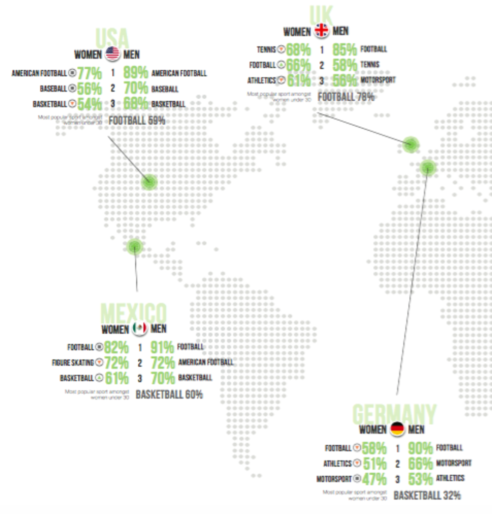 スポーツへの関心が年々高まりを見せている。ニールセンスポーツのデータによると、男女が共に関心のある娯楽は、旅行・音楽・映画などがあり、逆に男女で好みが分かれるのはスポーツ・技術・ファッション・文化といった分野だった。