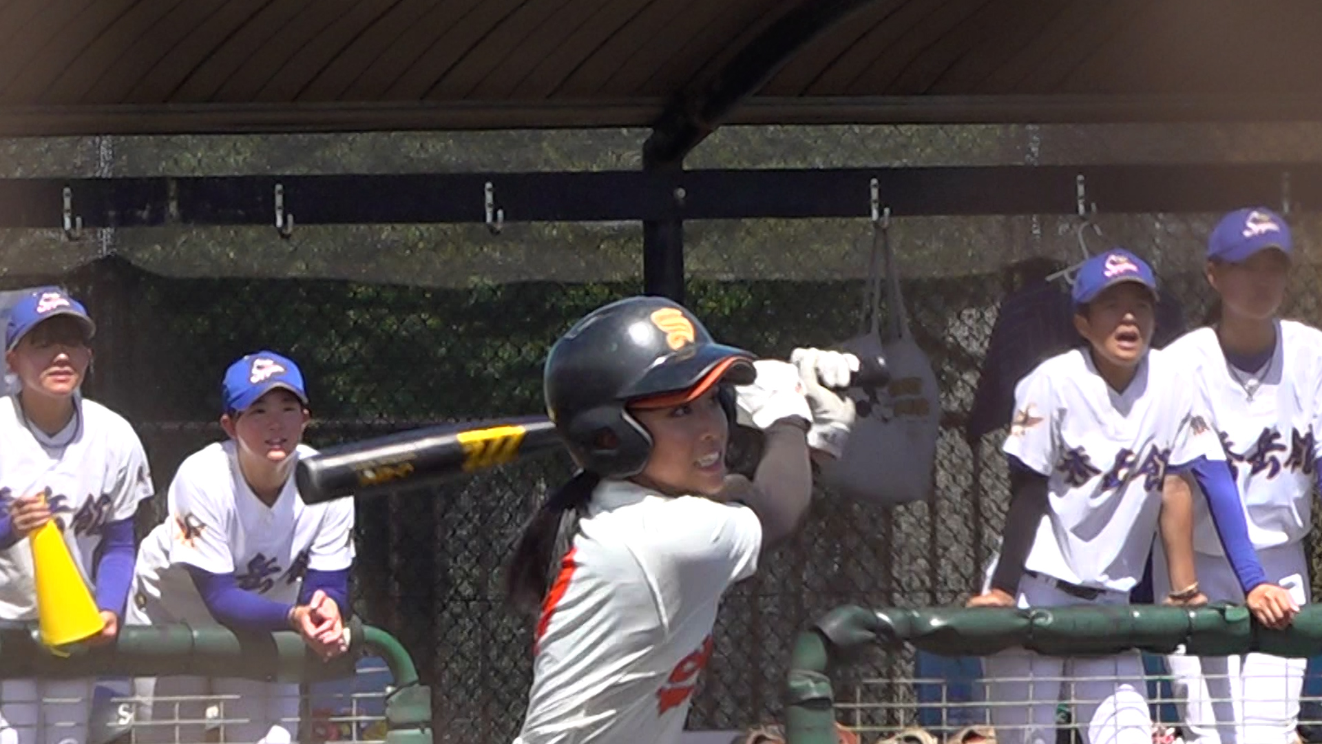 打席に立つ、4番比留間友香(ひるまともか)が、爽快な金属音と共に、値千金の逆転タイムリーを放つ! ベンチもスタンドも歓喜に包まれた。