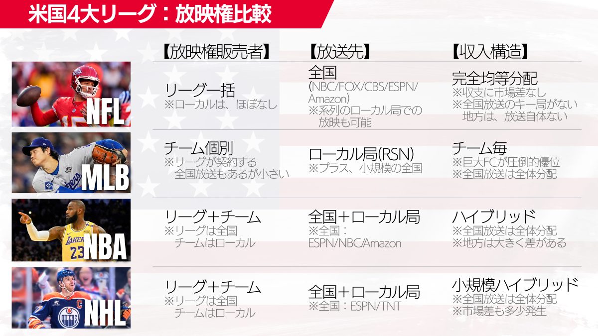 | NFL | 全国放映のみ。系列の地元TV局には放映権を付与。リーグ主導で巨大契約を一括管理。均等配分。 |