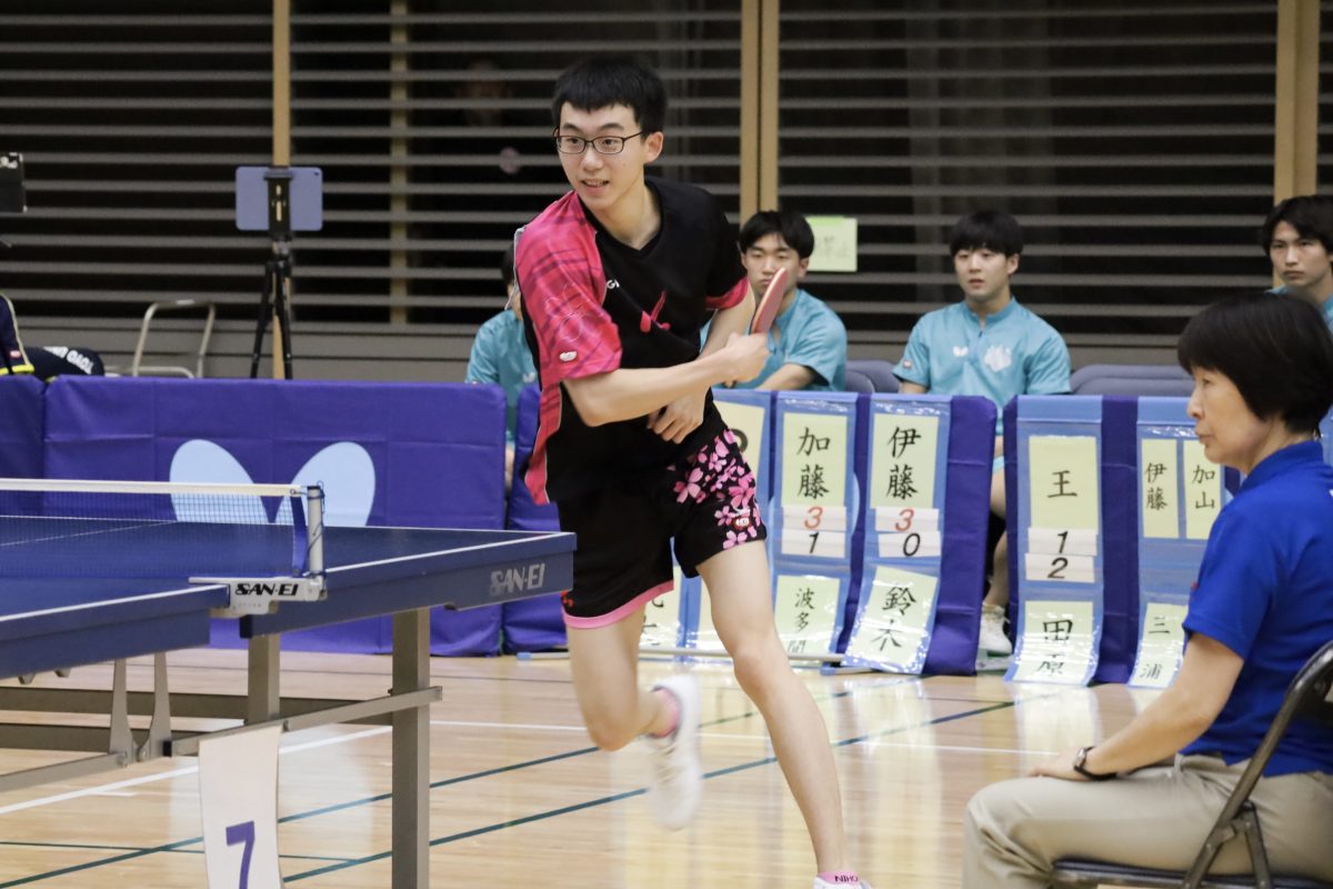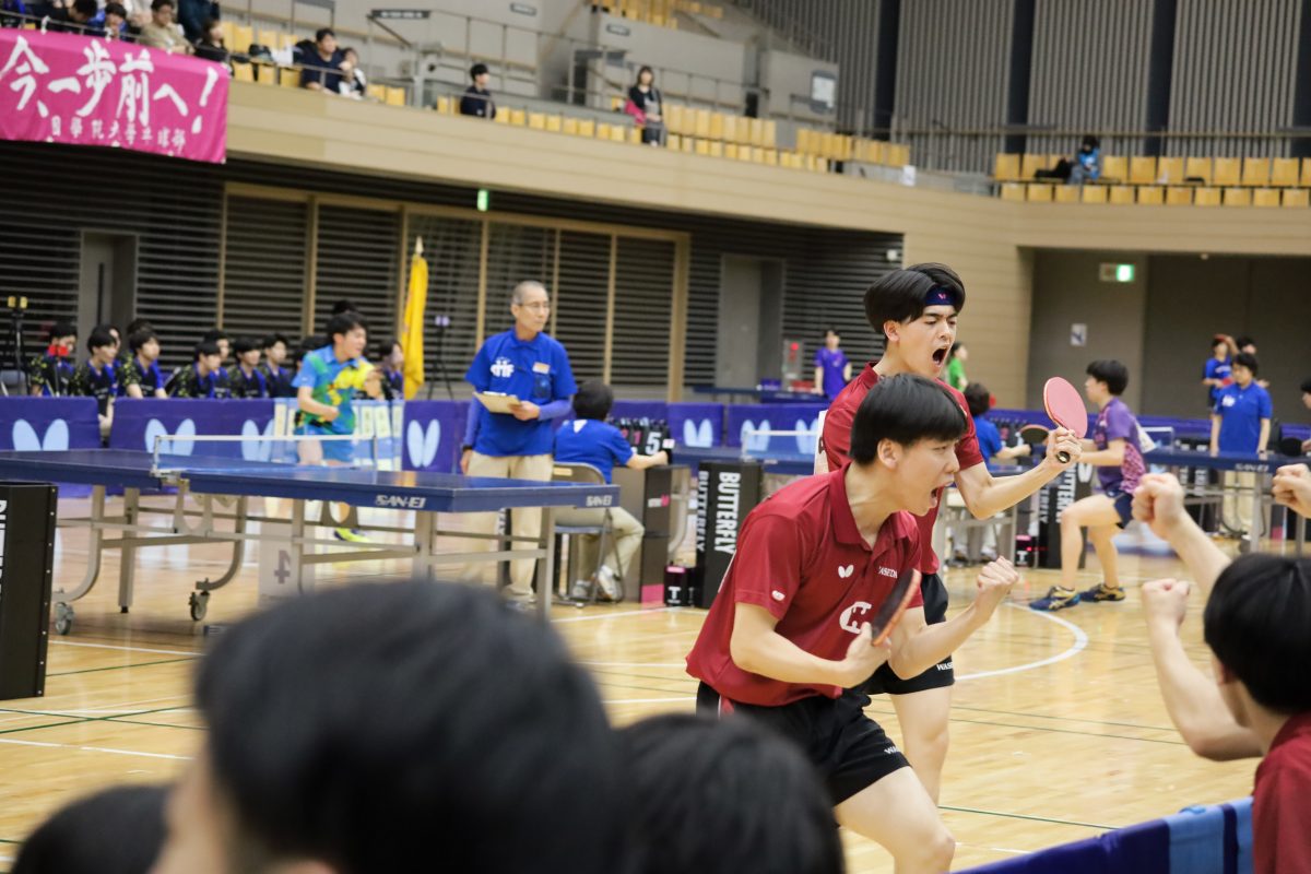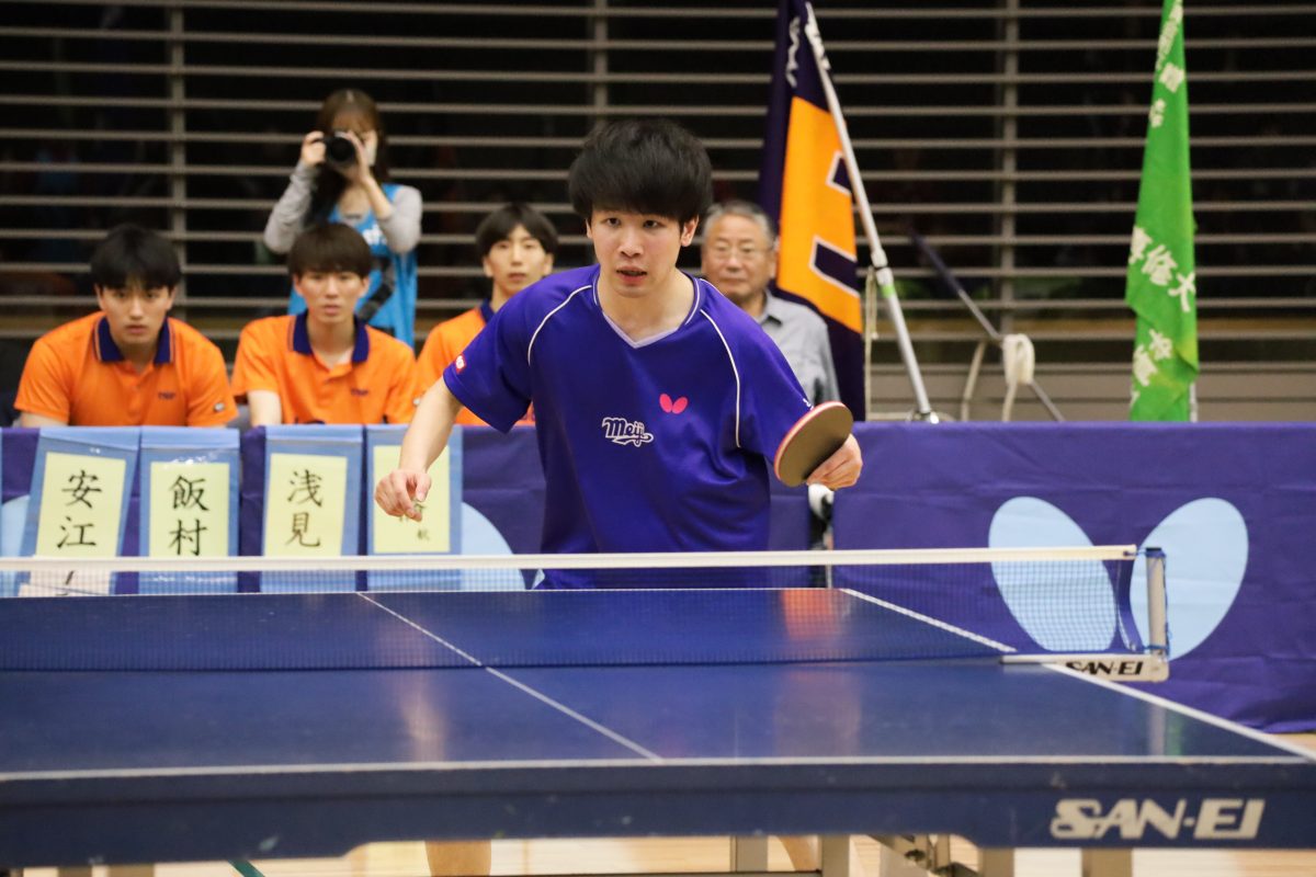 特に、6番で対戦した浅見勇志(明治大)と久保賢輔(専修大)は、いずれも福岡県・希望が丘高校の出身。互いの手の内を知り尽くした者同士の一戦では、序盤は浅見がリードする展開だったが、久保も粘りを見せて追いつき、勝負は最終第5ゲームへ突入。最終ゲームでは、終始リードを保った浅見が得意の両ハンド攻撃で久保を翻弄し、11-7で勝負を決めた。