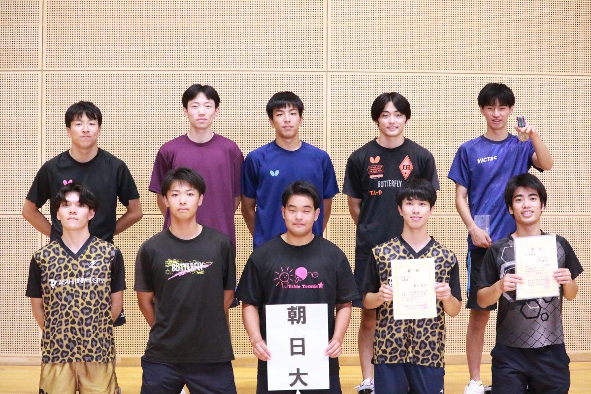 男子1部リーグでは愛知工業大学が5勝0敗の全勝で戦績を収め、8季連続105回目の優勝を果たした。最優秀選手賞にはシングルス、ダブルスで勝利した三木隼、男子殊勲賞にはシングルス、ダブルスで全勝をあげた岡野俊介(朝日大学)が選ばれた。